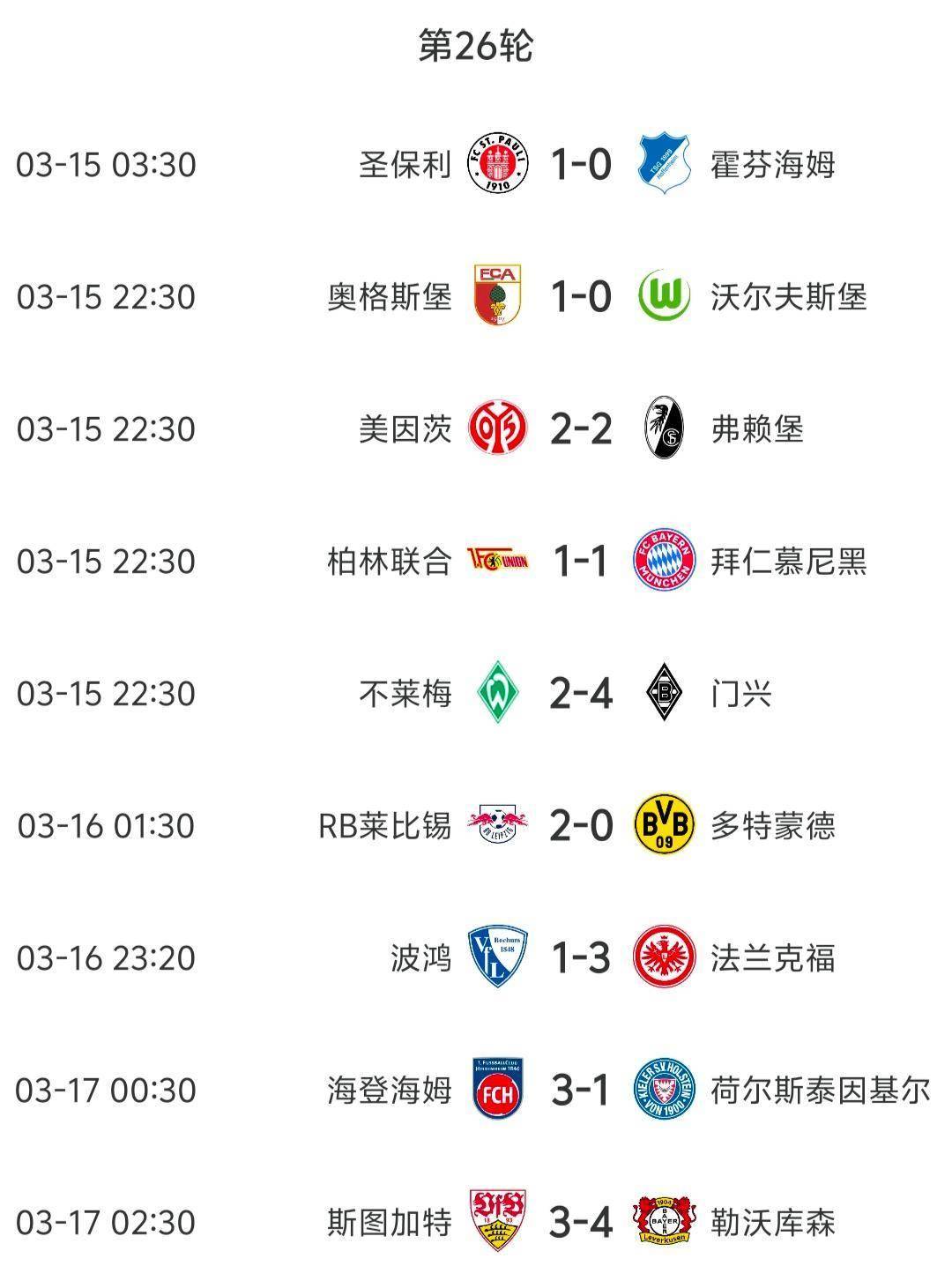 随着德甲第 26 轮比赛的全部结束,积分榜上的形势发生了新的变化。拜仁慕尼黑在本轮比赛中与柏林联合 1-1 战平,目前以 62 分领跑积分榜。勒沃库森在与斯图加特的比赛中以 4-3 获胜,积分达到 56 分紧随其后。美因茨和法兰克福分别积 45 分排名第三和第四,RB 莱比锡积 42 分排名第五,弗赖堡同积 42 分排名第六。
