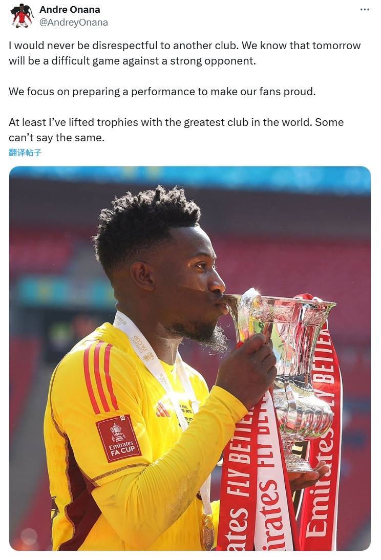 奥纳纳社媒回应:“我永远不会不尊重其他俱乐部,我们知道明天对阵强大的对手将是一场艰难的比赛。我们专注于准备一场让我们的球迷感到自豪的表演。至少我在世界上最伟大的俱乐部举起了奖杯,有些人却没有。”