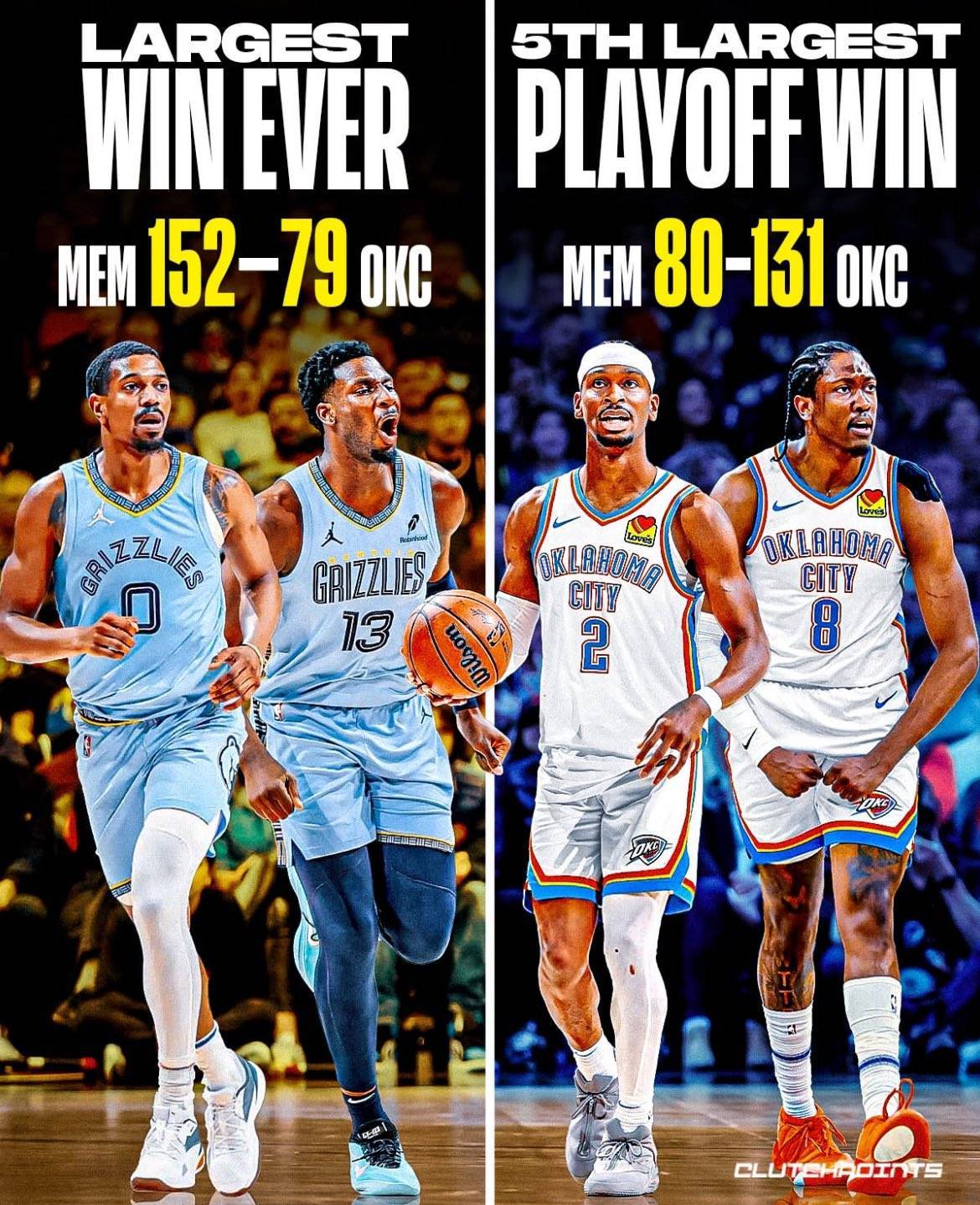 值得一提的是,2021年12月3日灰熊曾以152-79的历史最大分差狂胜雷霆。而今日,雷霆在季后赛完成了复仇。